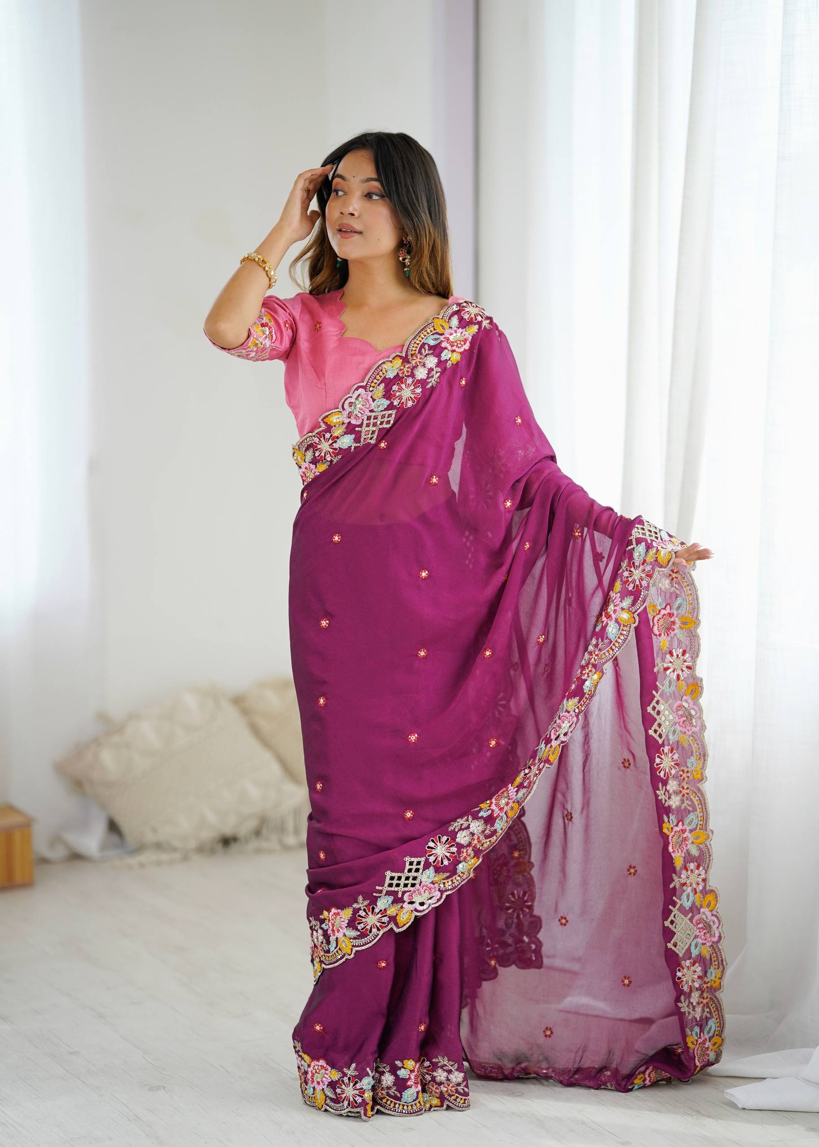 Introducing the elegant SC-1321 Premium Designer Saree, crafted from luxurious Noha Crush fabric and beautifully adorned with heavy thread embroidery, sequins work, and intricate hand cutwork. This real-modelling launch showcases a vibrant Magenta–Purple saree paired with a contrasting pink embroidered blouse, creating a rich and graceful festive look.