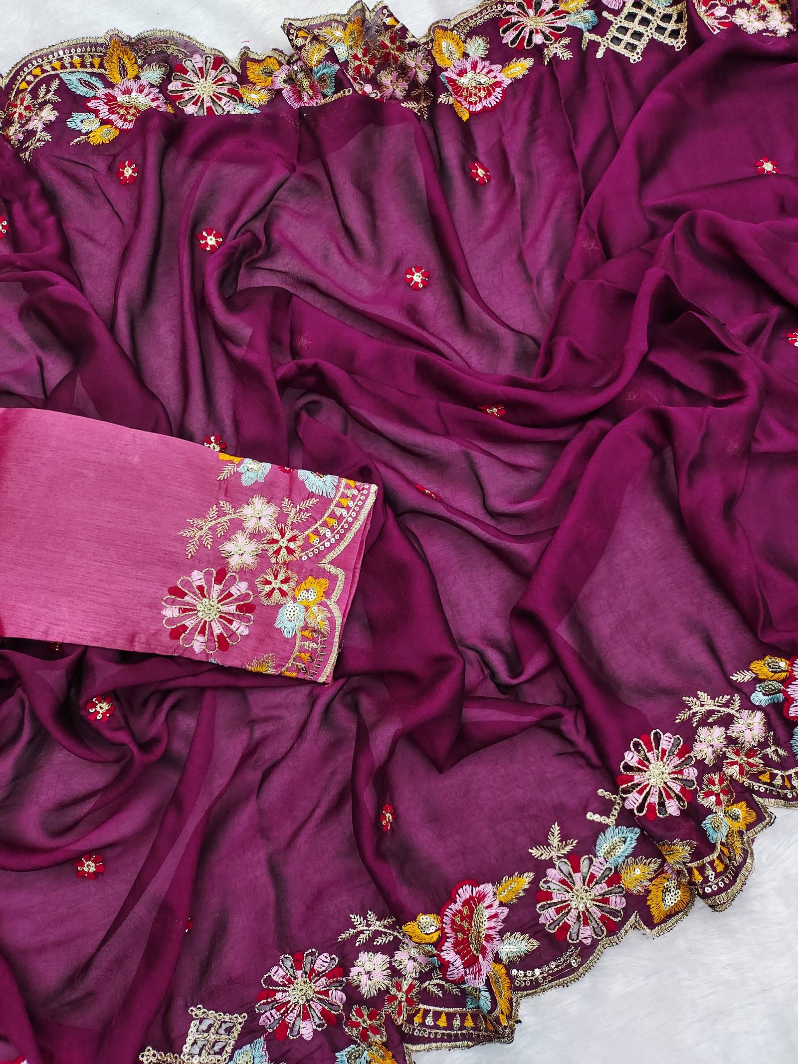 The saree features multi-coloured floral embroidery with shimmering sequins, making it perfect for weddings, receptions, festivals, parties and special occasions. The cutwork border adds a designer touch, enhancing both drape and elegance.