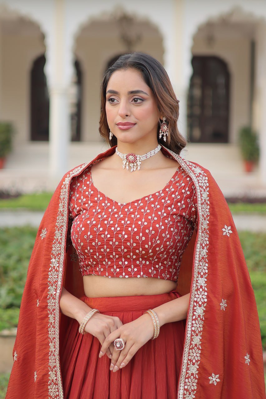 Rust-coloured NC Vichitra Silk lehenga choli with heavy sequins and thread embroidery, 3-meter flair and designer embroidered dupatta — premium festive & wedding wear.